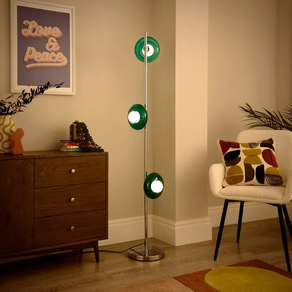 This unique floor lamp features three green glass shades on a chrome base, making it a striking addition to your home decor. It’s an eye-catching statement piece that enhances any living space.