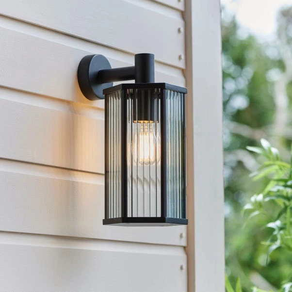 A versatile and stylish addition to illuminate your exterior and interior spaces with modern flair. Featuring clear ribbed textured glass with a distinctive textured black detail, this wall light adds a touch of sophistication to your porch, hallway, garden, or bathroom. The hexagonal shape enhances its contemporary aesthetic while offering a unique visual appeal. Crafted to withstand outdoor elements, the Hex Wall Light is suitable for both outdoor and bathroom use, providing flexibility in placement.