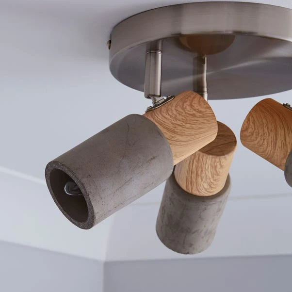 This modern 3 light dimmable fitting is perfect to add a stunning centrepiece into your room. Boasting a smooth concrete finish with wood effect detailing and a brushed satin nickel finish on the base.