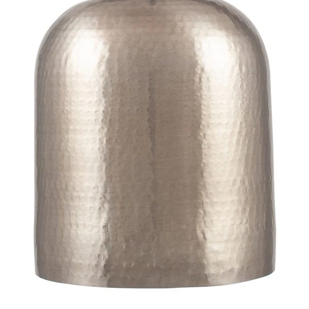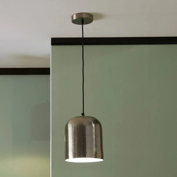 Handcrafted in India, the Kochi Hammered Metal Dome Pendant Light adds a touch of artisanal charm to any space. Its compact size and textured hammered finish make it a versatile choice for illuminating kitchen islands or dining tables, available in antique silver for added elegance.