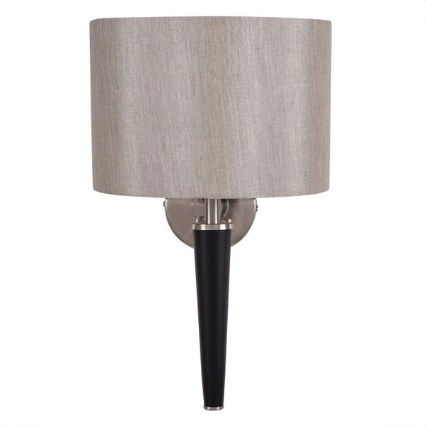 The Lowry Metal Wall Light exudes sleek and modern contemporary style, resembling hotel chic with its matt black tapered stem and brushed silver details. Topped with a slubby grey faux silk shade, it adds sophistication to any wall.