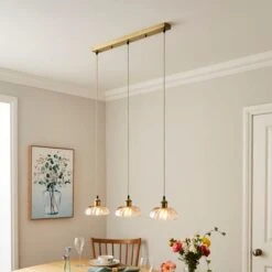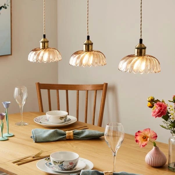 Striking in design and perfect as a centrepiece, the Lucille 3 Light Adjustable Diner Ceiling Light features beautiful floriated glass shades, each suspended from adjustable twisted flexes.