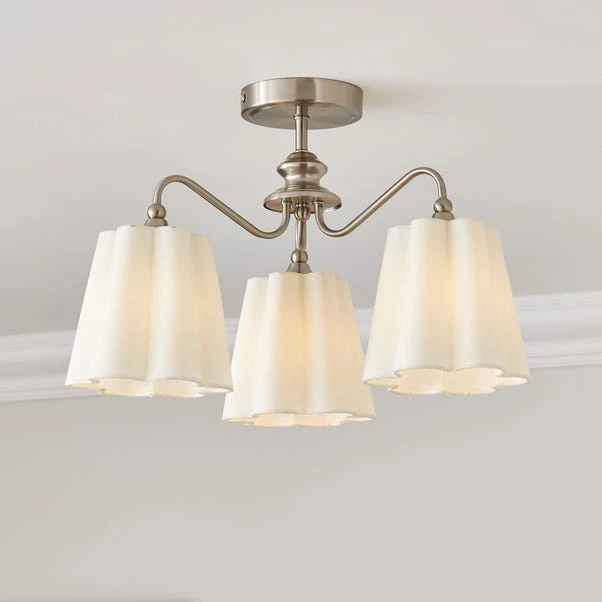 Gorgeous petal-shaped shades and a satin nickel metal frame define this semi-flush ceiling light. It’s an elegant choice for any room, adding a touch of sophistication.