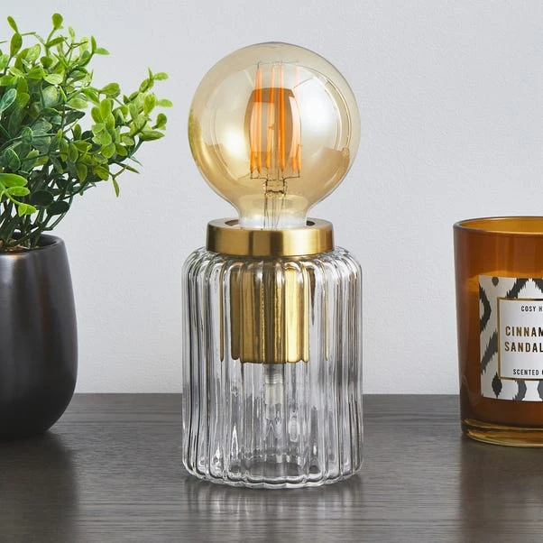 Add a modern touch to your home with this simple yet stylish Natalia Table Lamp. Beautifully designed with ribbed glass and a satin brass effect plate, this table lamp is available in a choice of two colours to complement your home décor style. To complete the look, pair this lamp with a decorative bulb for a luxurious look.