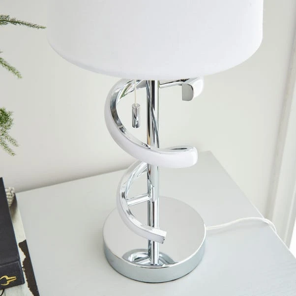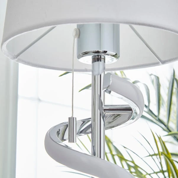 This dual-lit table lamp features an integrated LED swirl light, providing a unique and mesmerising illumination. Finished in chrome with a recycled faux linen shade, the Palais Table Lamp seamlessly combines modern aesthetics with sustainable design. The pull cord switch allows for convenient control over the lighting, offering flexibility in creating the perfect ambience for any setting. Explore the opportunity to coordinate your lighting style seamlessly with matching family items, available to purchase separately.