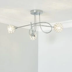 This stunning Portia ceiling light, with a swirled arm structure, 3 lights and 3 spherical acrylic shades will complement an array of home decors beautifully. The acrylic jewel beads design adds a touch of glamour, along with the chrome finish. The matching wall light, table lamp and floor lamp are also available.