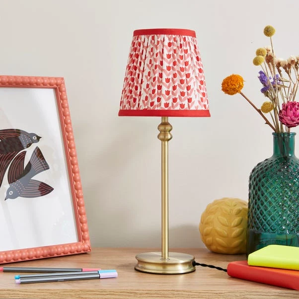 This lamp features an exquisite antique brass plated finish, adding an aura of sophistication to any space. Its distinctive ditsy printed lampshade, accentuated with a vibrant red trim, is a delightful complement to the lamp’s overall design. The standout feature of this lamp is the stunning stacked bobble design, which adds texture and visual interest, making it an eye-catching addition to any room.
