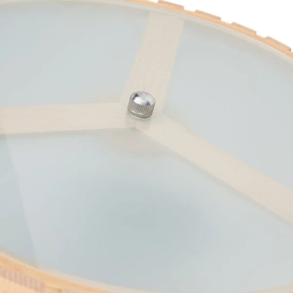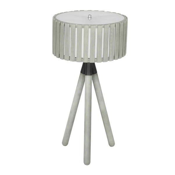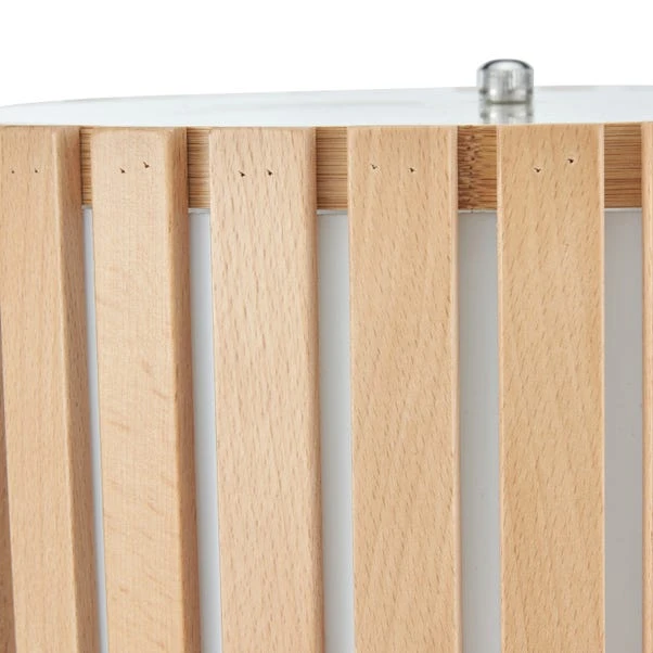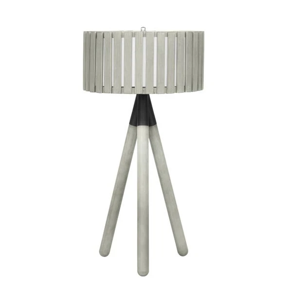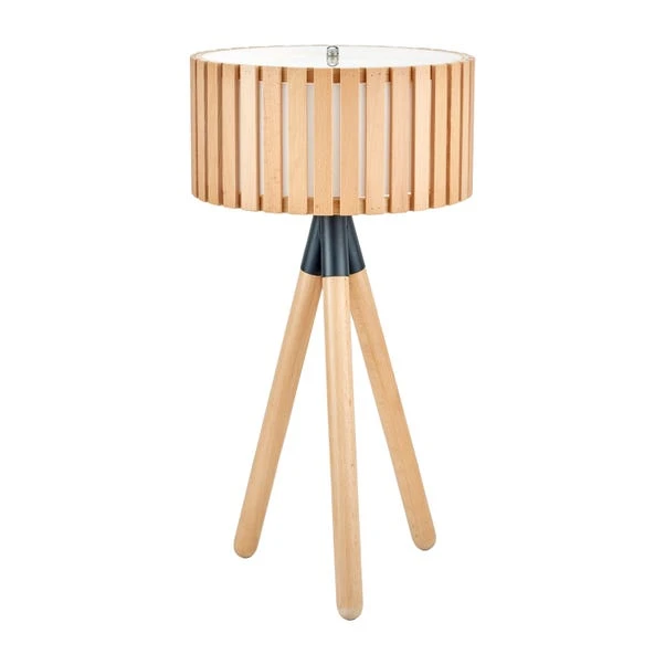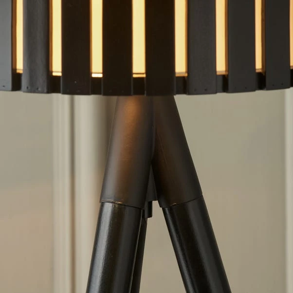 The Rabanne Wooden Slat Tripod Table Lamp boasts a sleek, modern tripod design finished in striking black. The wooden slatted shade elegantly diffuses the light, while the tripod element gives this table lamp a contemporary edge.