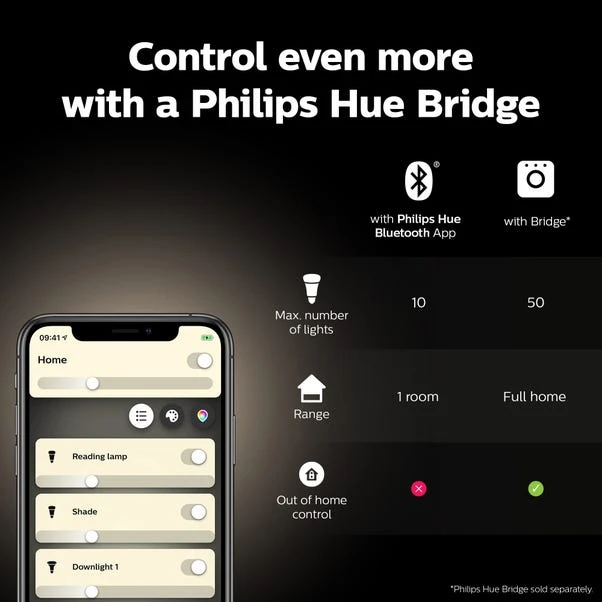 Perfect for a smaller lamp, these Philips HUE bulbs are a great smart solution for your home. With its soft white light, you can create the perfect ambiance in any room. Need a brighter light? No problem! The dimmable feature allows you to adjust the brightness to your liking. And with instant control via Bluetooth, you can easily turn your lights on or off with just a few taps on your phone.