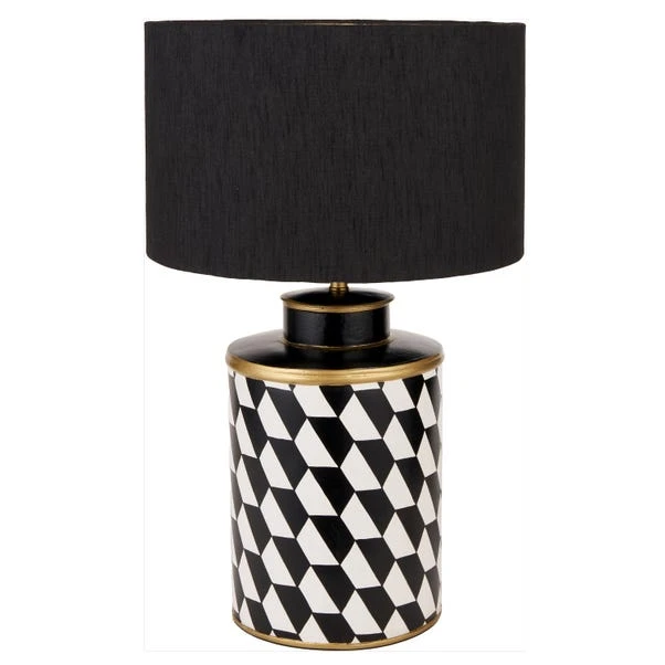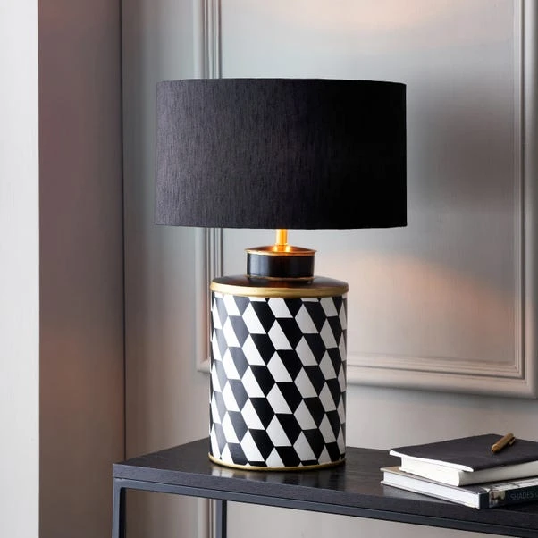 The Victor Geometric Hand Painted Table Lamp with 35cm Stellan Slubbed Silk Shade is a stylish and quirky addition with an on-trend monochrome design on the lacquered iron base. Paired with a 35cm faux silk cylinder shade, this lamp is a luxurious choice, offering versatility in any interior.
