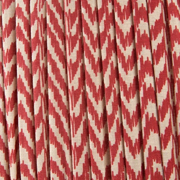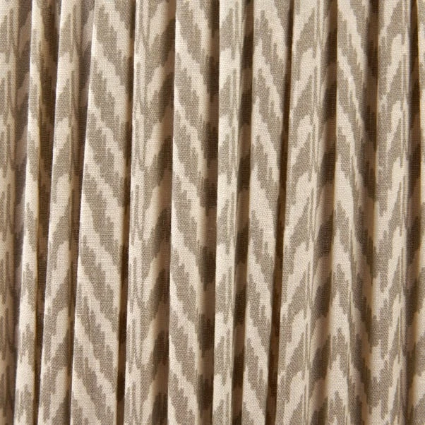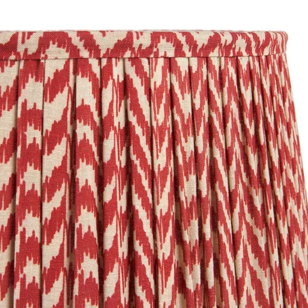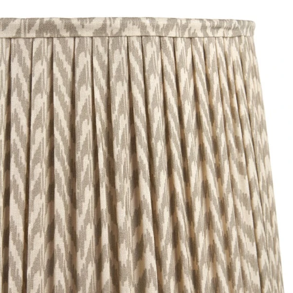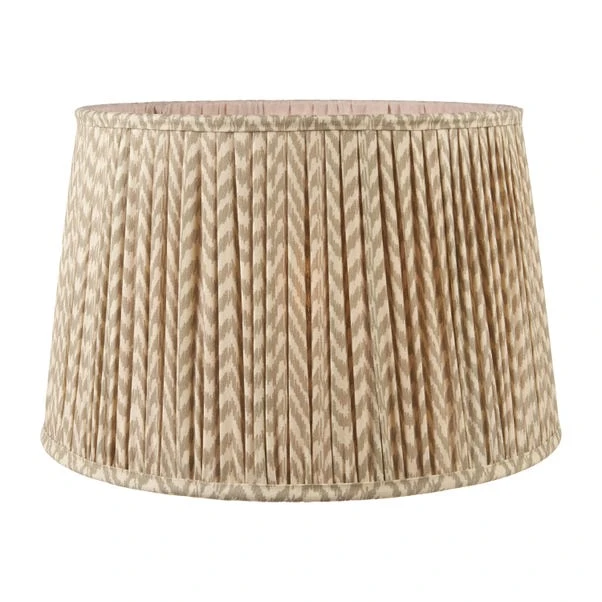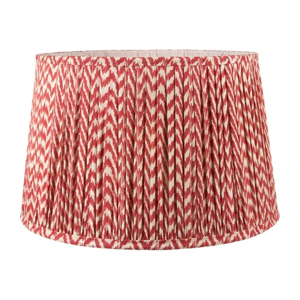 This Vienna Chevron Mushroom Pleat Shade features an in-house curated print reminiscent of the ikat style, adding a touch of modern-classic elegance to any room. Available in various colours and sizes, its hand mushroom pleated design softens the linear pattern for a sophisticated look.