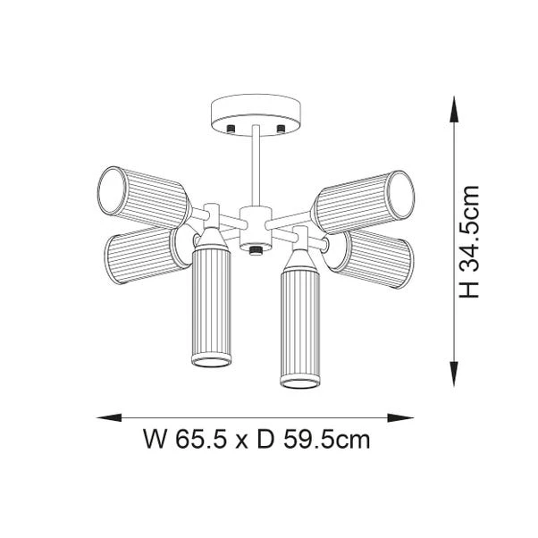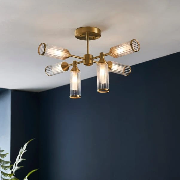 Why not make a statement with Vogue Lighting’s Art Deco 6 Light Semi Flush Ceiling Light? With satin brass plated metalwork, clear ribbed glass shades capped with metal edging, and frosted inner glass diffusers it’s guaranteed to be a head-turner. Dimmable compatible, it allows for customisable ambience.