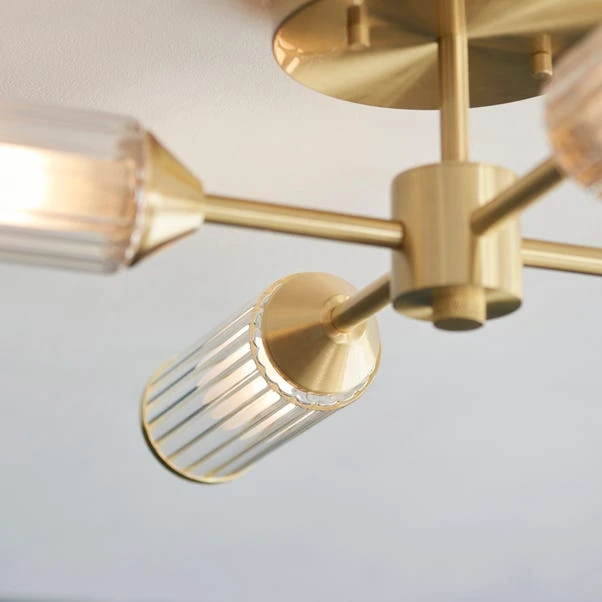 Make a statement with the Vogue Lighting Bailey Ribbed 4 Light Semi Flush Ceiling Light, featuring a modern design inspired by mid-century style. Each clear ribbed glass shade, capped with brushed brass metal edging, adds a touch of elegance.