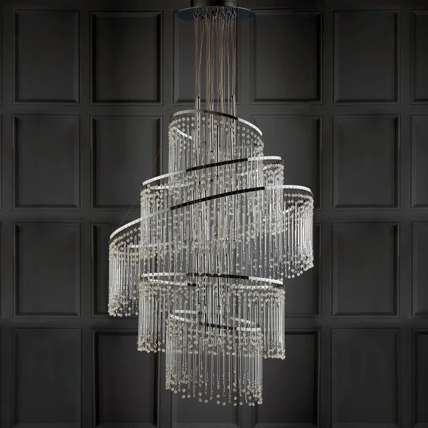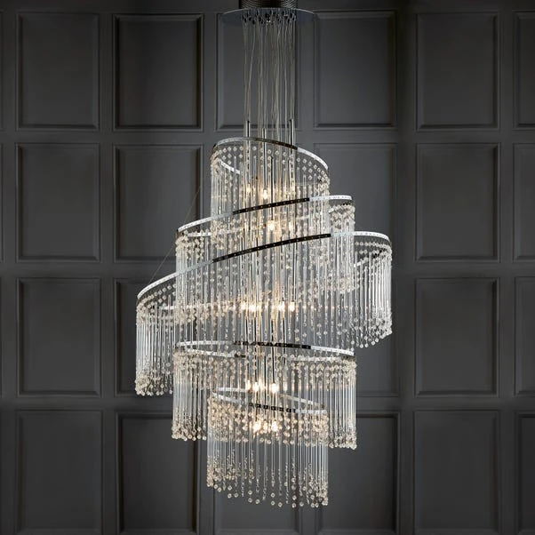 Adorned with a mix of delicate slender glass rods and faceted glass beads cascading throughout the multi ring pendant, the Camille Chandelier would make for an impressive statement piece. This 24 light chandelier features 5 stunning chrome finished rings in an elegant tiered design for a truly magnificent finish.