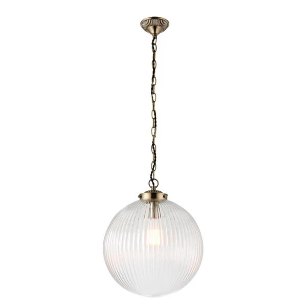 The College ceiling pendant fitting features a ribbed, spherical glass shade hanging from a decorative chain finished in antique brass, offering a modern take on a traditional look. Ideal for a range of settings, this light fitting is height adjustable and is compatible with dimmer switches.