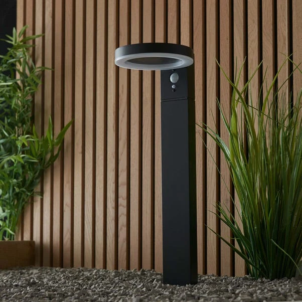 Light up your walkway or garden path with the Idris Outdoor Solar PIR Floor Light, constructed from robust corrosive resistant aluminium with a sleek and stylish design to bring modern luminous vibes to your garden. Featuring simple circular shapes and a contemporary black textured finish, this solar powered post style lighting has a modern glow with a white diffuser and built in Photocell and PIR. This floor lighting is ideal for combining with other items of outdoor lighting in the Idris range for a synchronised and coordinated look.
